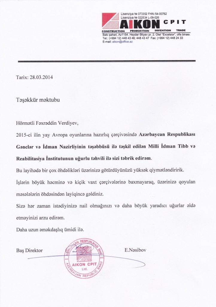 I congratulate you with the successful completion of The National Sports Medical and Rehabilitation Institute initiated within the organizations for the European Games in summer, 2015 by The Ministry of Sports and Youth of the Azerbaijan Republic.