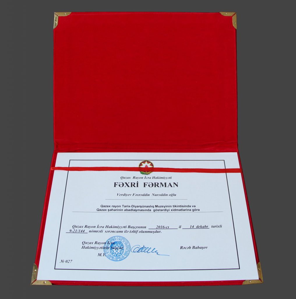 For outstanding services in building of the Historical Museum of Qazakh city And Refurbishment of Qazakh city