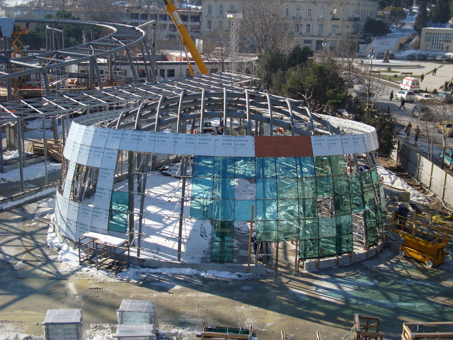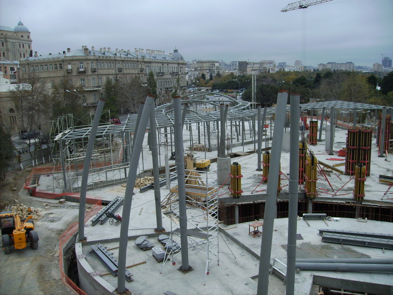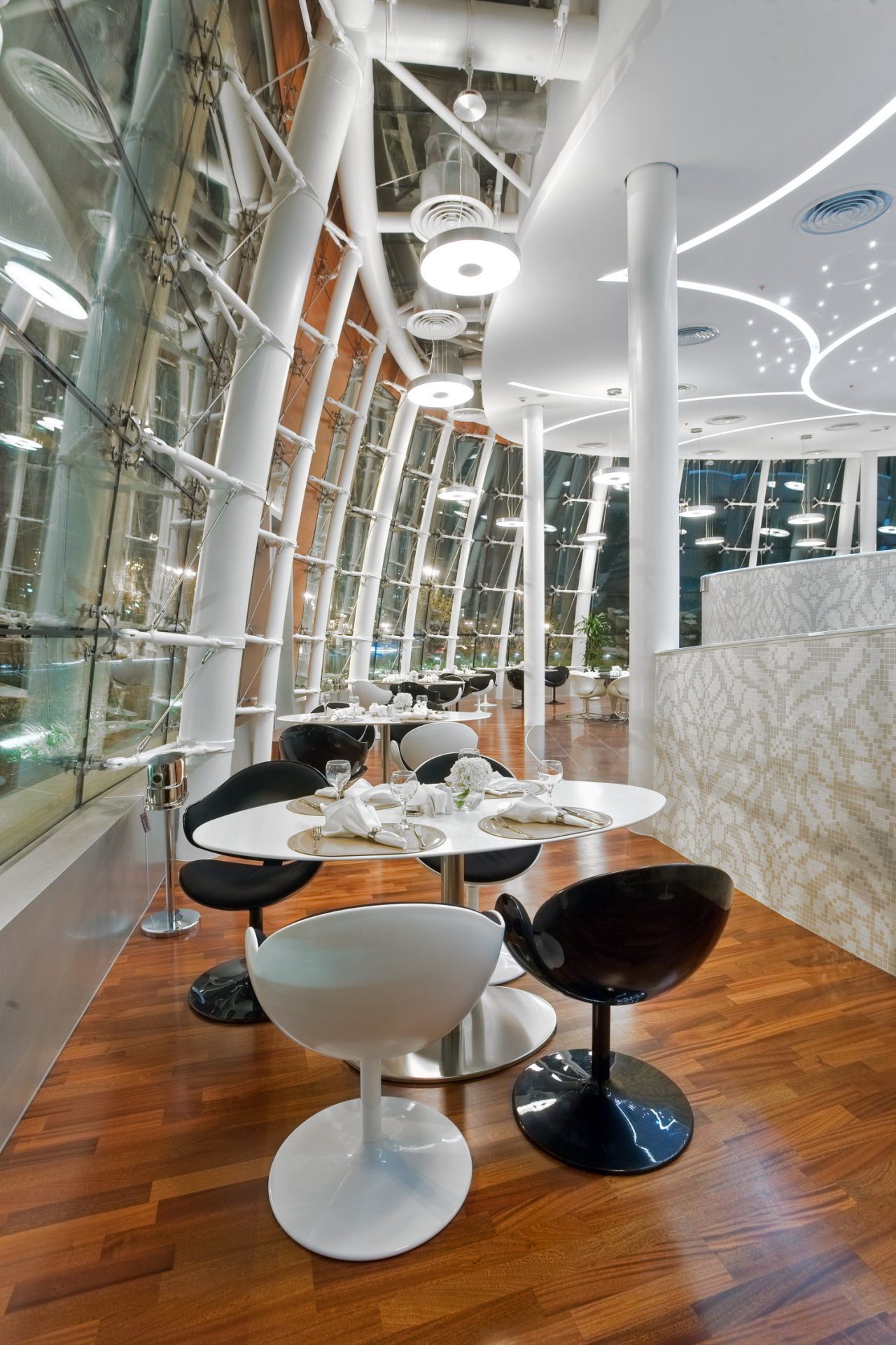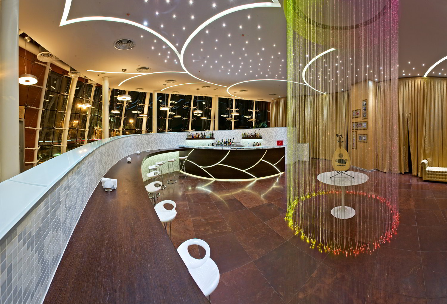 The 7.500 sq.m building reminds of the parts of tar, an ancient musical instrument of Azerbaijan. The 3-storey building includes 350-seat concert hall, club, classrooms, recording studio, 80-seat restaurant “Ud”.